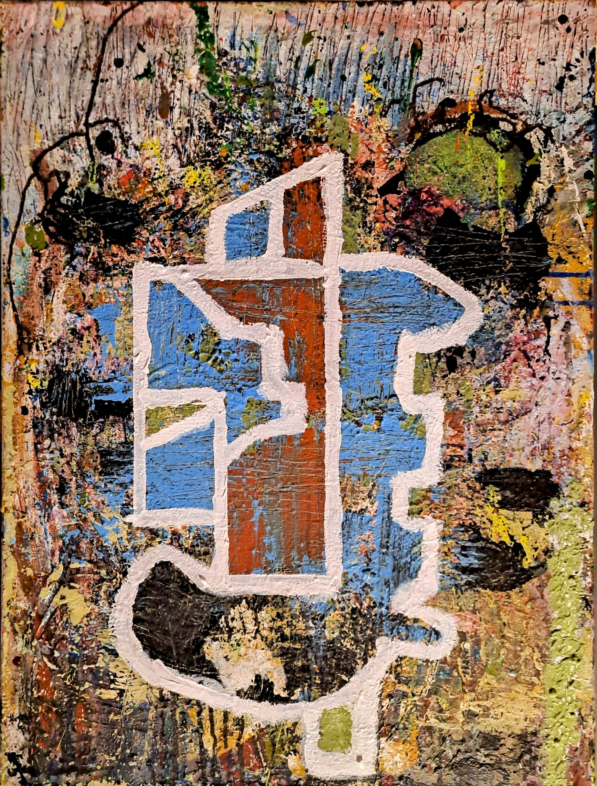 En flodhest på hovedet træder frem af farvernes vilde strøm, og bærer roens kraft midt i kaos. Dens krop vokser ud af både jord og vand, med konturer der rummer styrke og leg. Den hvide ramme fastholder dens skjulte symbol, et urtids dyr der minder os om naturens stille vægt.