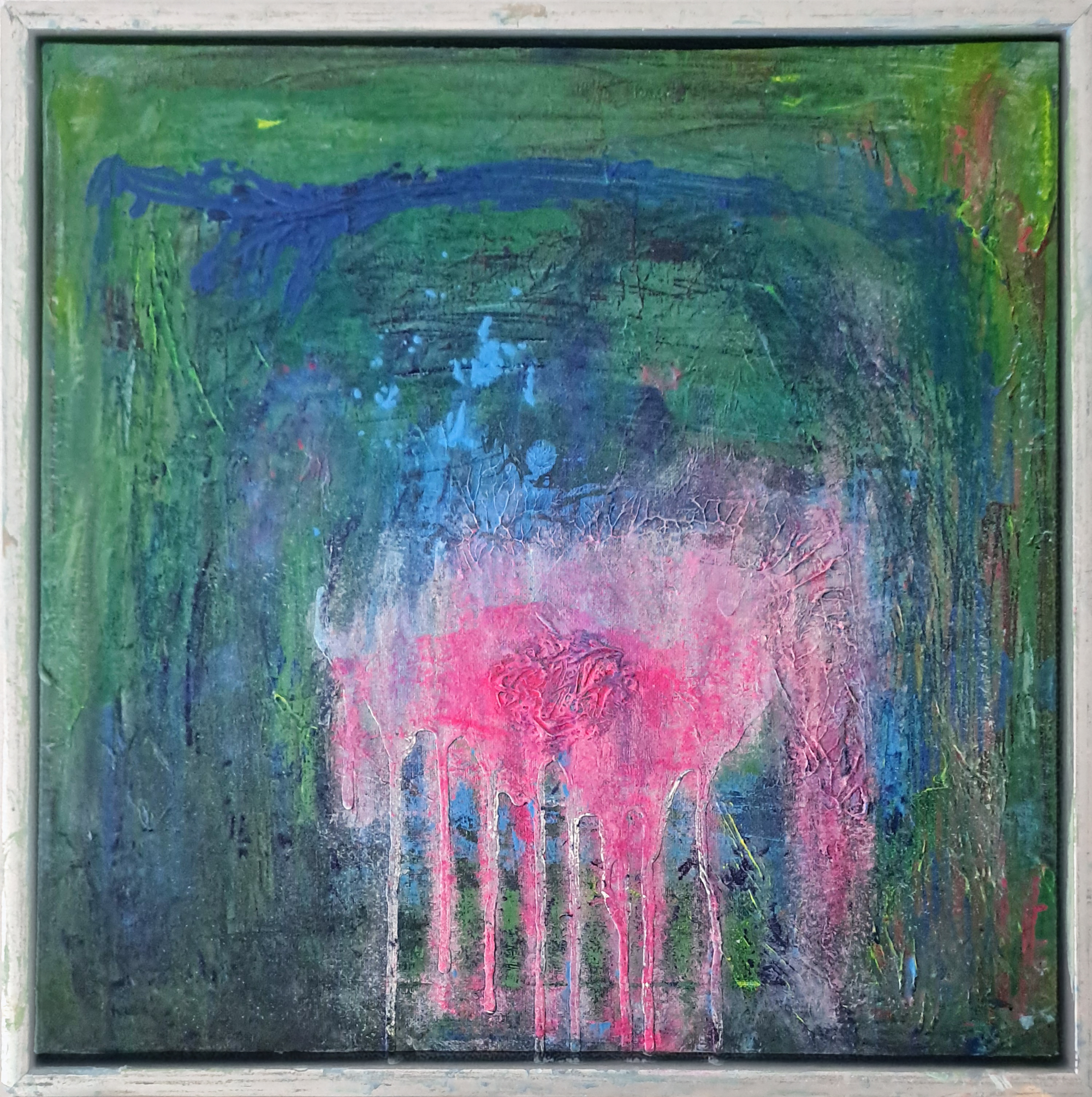 En lyserød sky vokser frem af mørket, som et væsen mellem drøm og virkelighed. Farven løber som tårer, opløst i tidens strøm. Bagved danser blå og grønne lag af stilhed, som om naturen selv vogter på et hemmeligt hjerte.