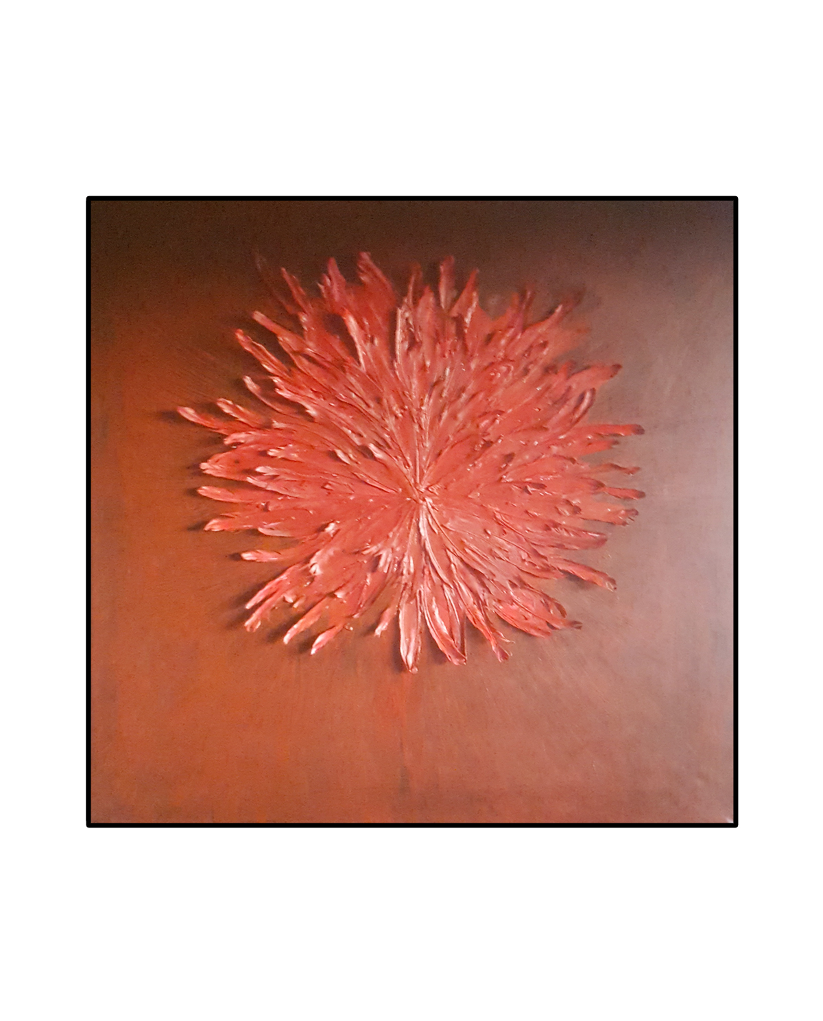 Underneath a black background with a dark red overlay. Red feathers mounted in a circle at the center of the painting creating an unnatural atmosphere.