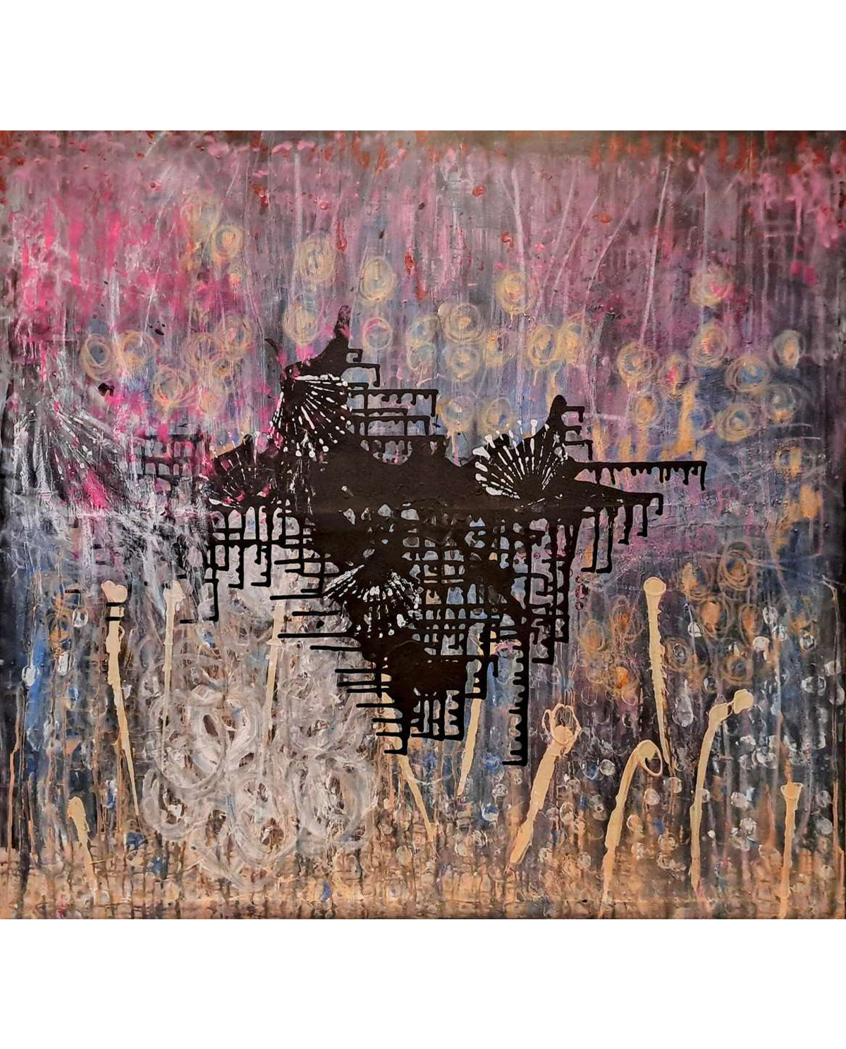 Som en skygge, der vokser i nattens have, rejser sorte strukturer sig mod et hav af lys. Baggrunden pulserer i lilla og gyldent, som stjerner, der drømmer i bevægelse. En kraftfuld stilhed – både truende og smuk.
