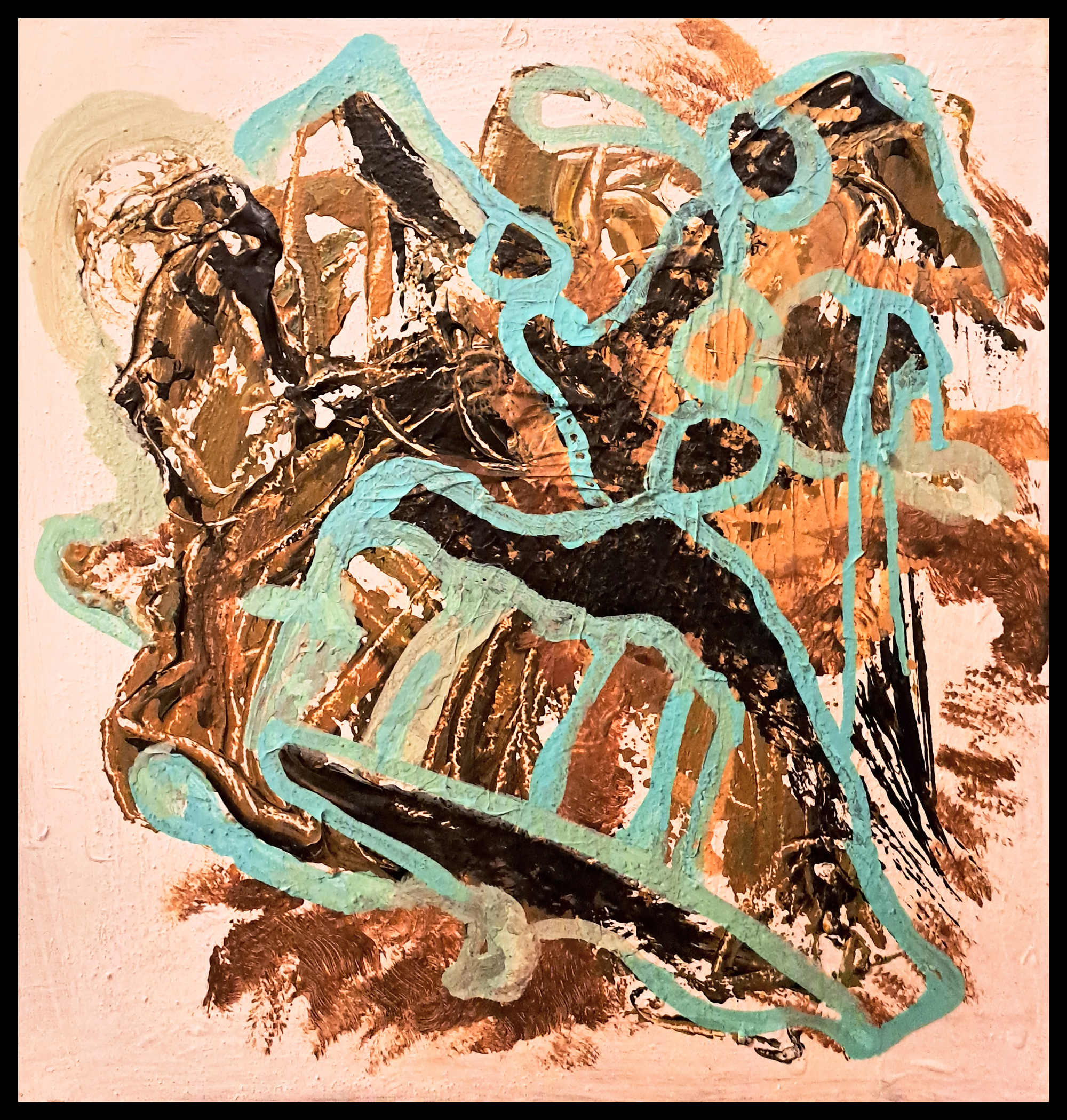 Som en drøm i bevægelse slynger formerne sig gennem lærredet – brune og sorte konturer minder om rustning og klippe, mens turkisens flydende linjer skærer som en strøm gennem det hele. Maleriet fanger et øjeblik af kamp og opløsning, hvor ridderen næsten bliver ét med naturens kaos. Han opløses i sine egne skygger, hvor metal og natur smelter sammen.