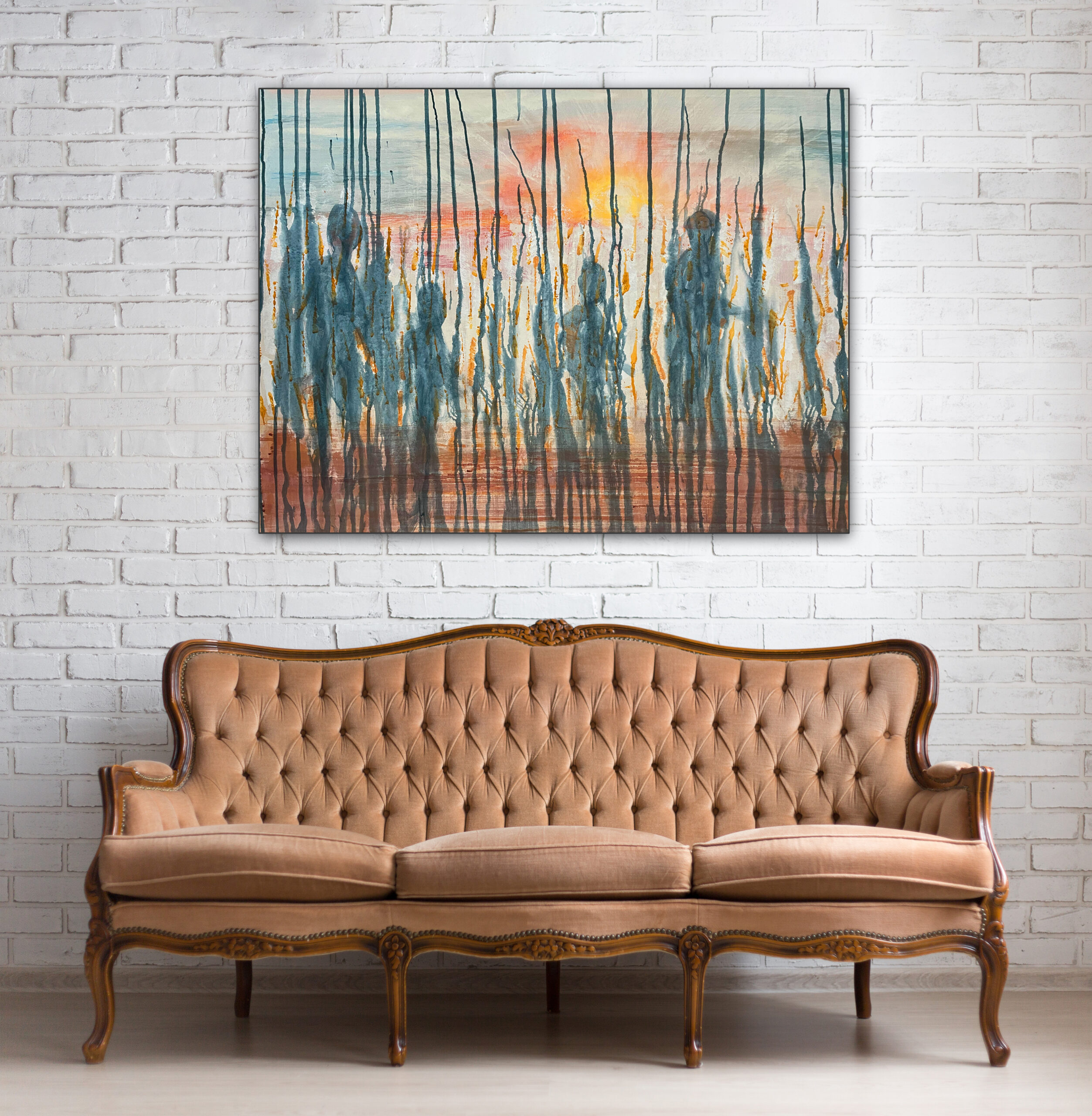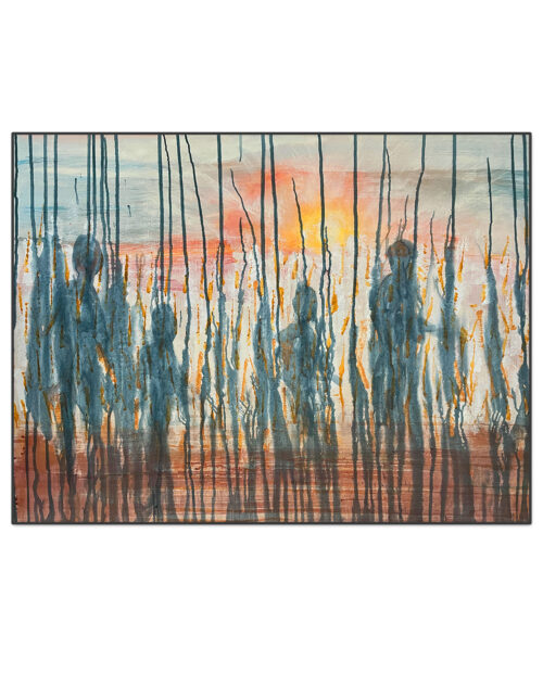 Som et brusende væv af ild, vand og sollys slynger farverne sig gennem lærredet. De rusterøde streger skærer som ar i overfladen, mens det turkisblå bryder frem som lysglimt af håb. Gyldne toner stråler, men forsvinder pludseligt ind i skyggernes dybder. Penselstrøgene bærer på en rastløs energi – som et øjeblik, hvor alt er på spil, hvor verden både fødes og brydes på ny.