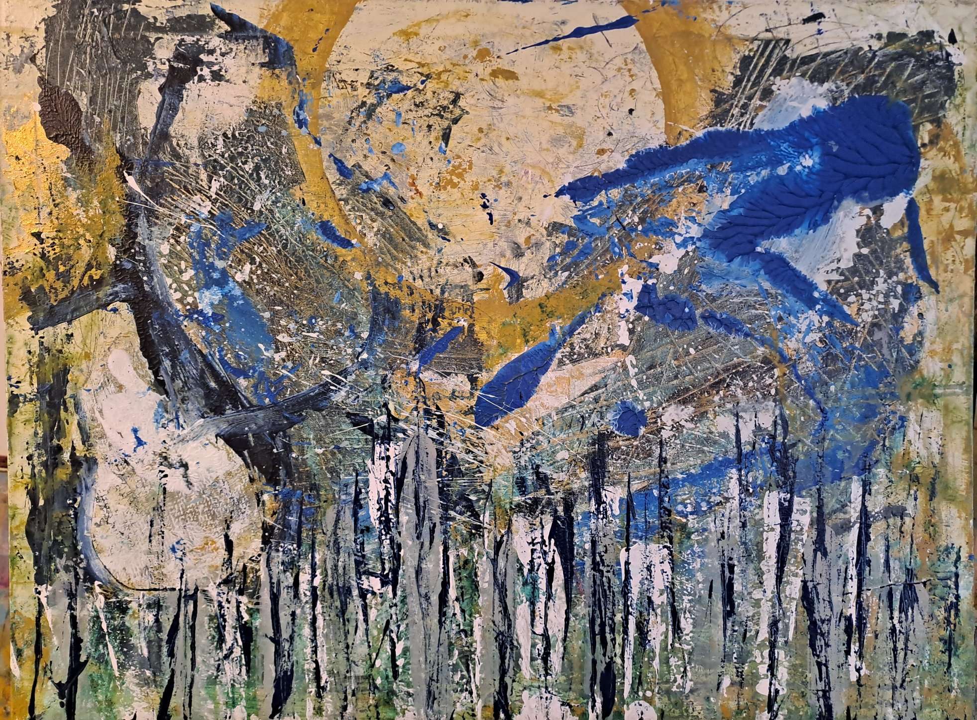 Som et brud i nattens favn flakker skygger af blå energi mod himlens åbning. Månen svulmer som et stille øje, men lyset kan ikke holde dem fast. De bryder fri, som drømme der slipper jordens greb – et øjeblik af flugt, hvor kosmos selv ånder ud.