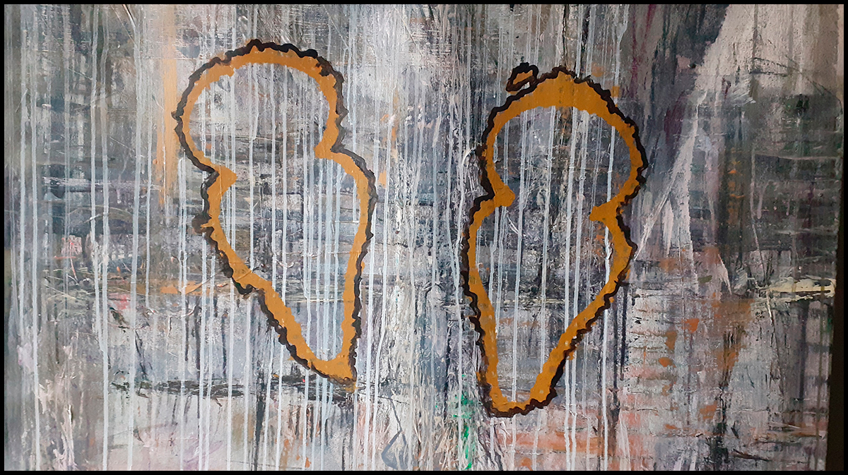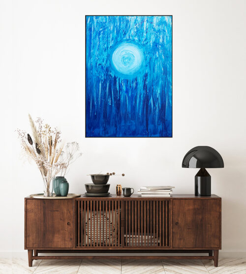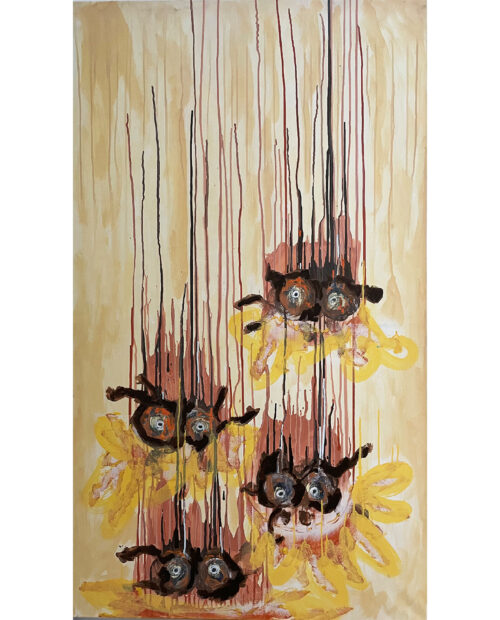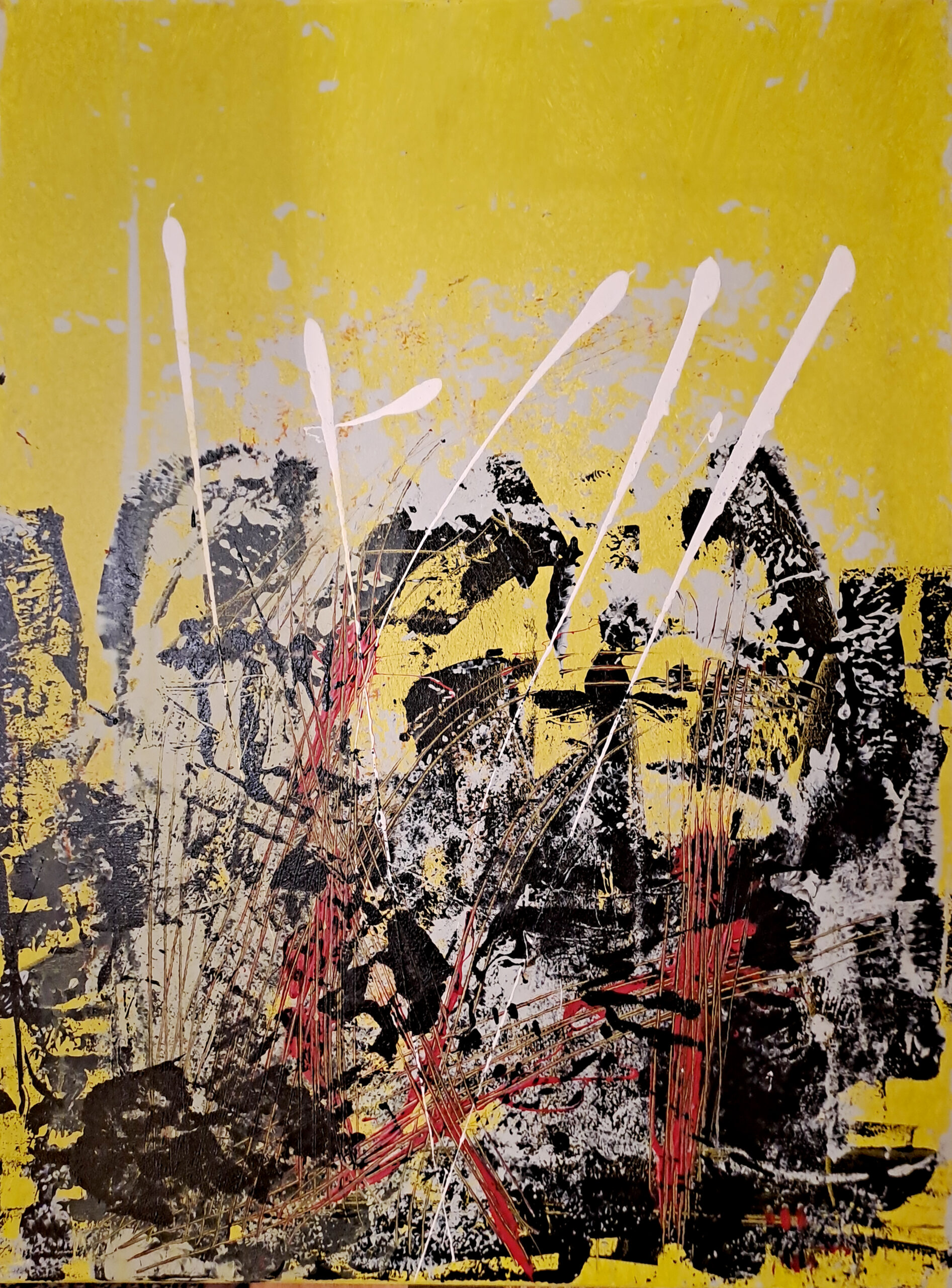 Et skrig af farver og kontraster – hvor sortens kaos brydes af gule glimt og hvide strejf som lyn gennem tågen. Røde årer pulserer som liv under overfladen, mens lyset kæmper sig vej gennem mørket. Et øjeblik fanget mellem opløsning og begyndelse.