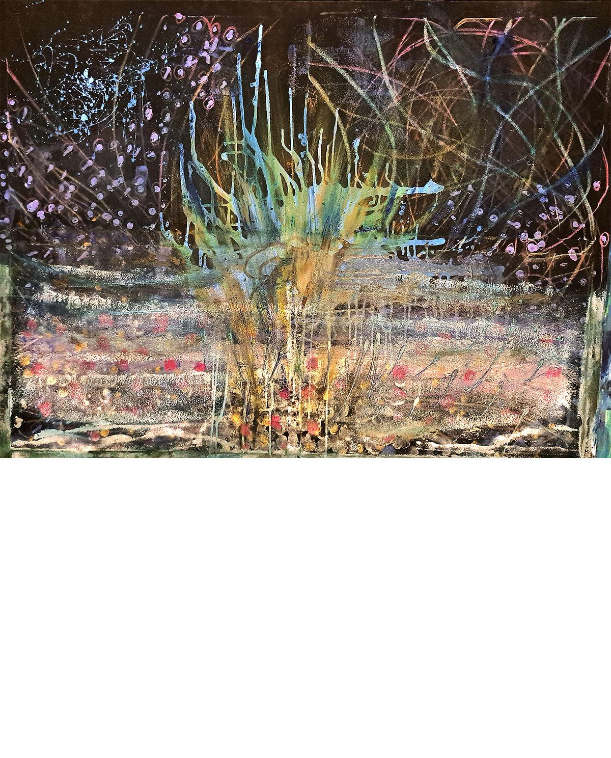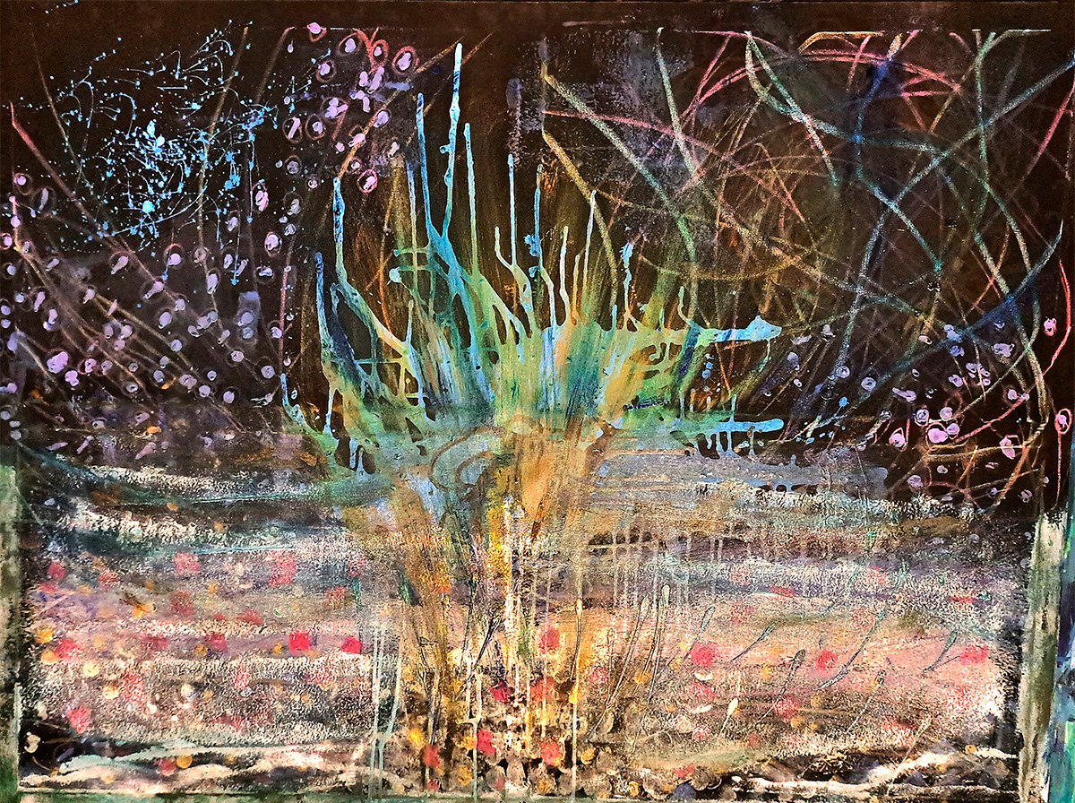 Et udbrud af lys rejser sig fra mørkets dybder som en vækst, der trodser tyngden. Farverne slynger sig i baner på himlen, som stjernernes egne tegninger, mens blomstrende prikker af lilla og rød bryder jorden som små galakser i miniature. Midten spirer af liv, et grønt og gyldent væsen, der strækker sig mod uendeligheden – som et træ, et fyrværkeri, en portal. Alt omkring sitrer af bevægelse: dråber, linjer, spor af energi, som om billedet selv ånder. Det er en have, hvor universets kræfter mødes, og hvor tidens grænser opløses i ren skabelse.
