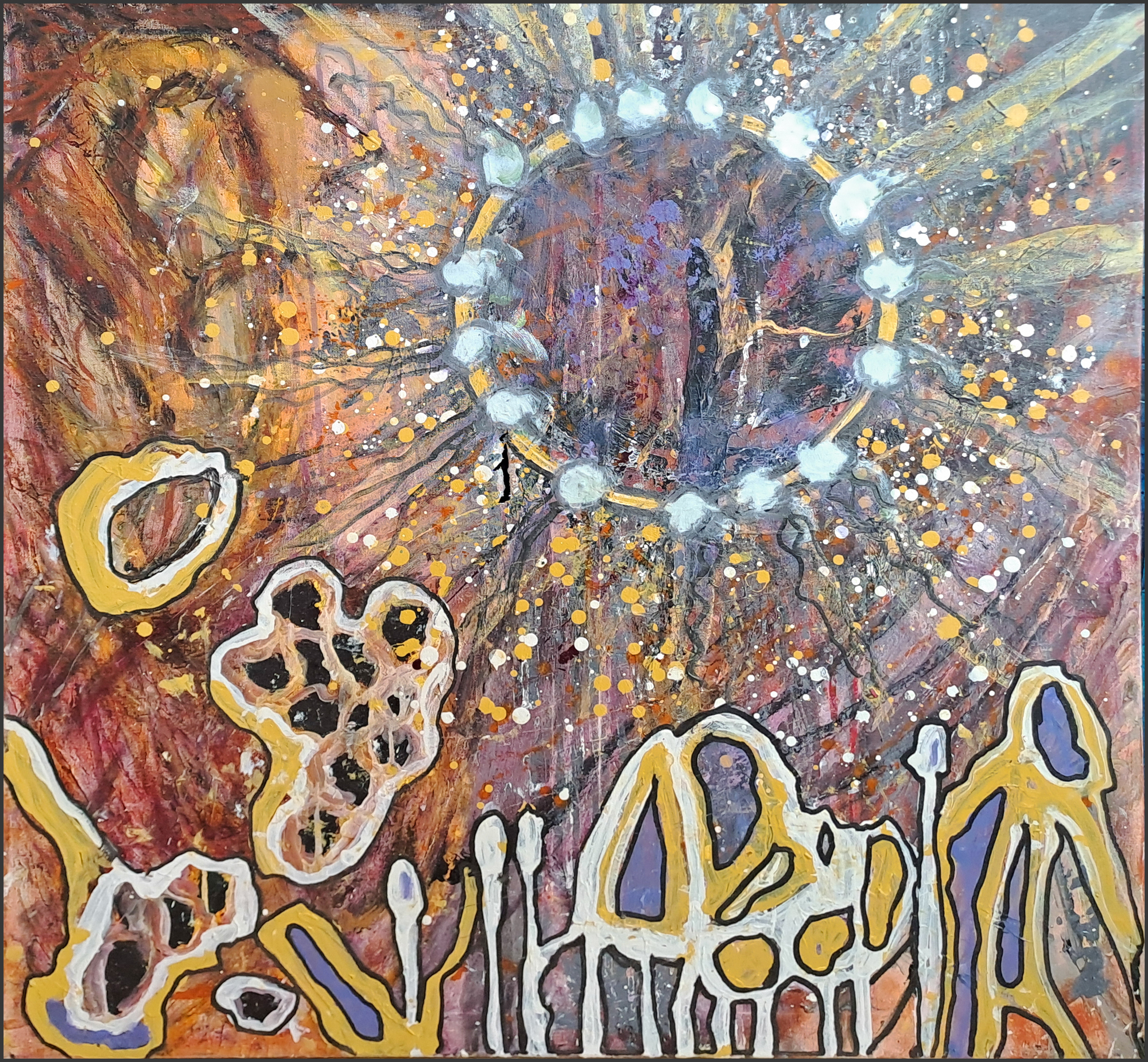 Et glødende centrum åbner sig som en levende port, hvor lys og skygge væves sammen i organiske mønstre. Farverne pulserer som kosmisk energi, og formerne minder om svampens mycelium – en hemmelig forbindelse mellem det jordiske og det universelle.