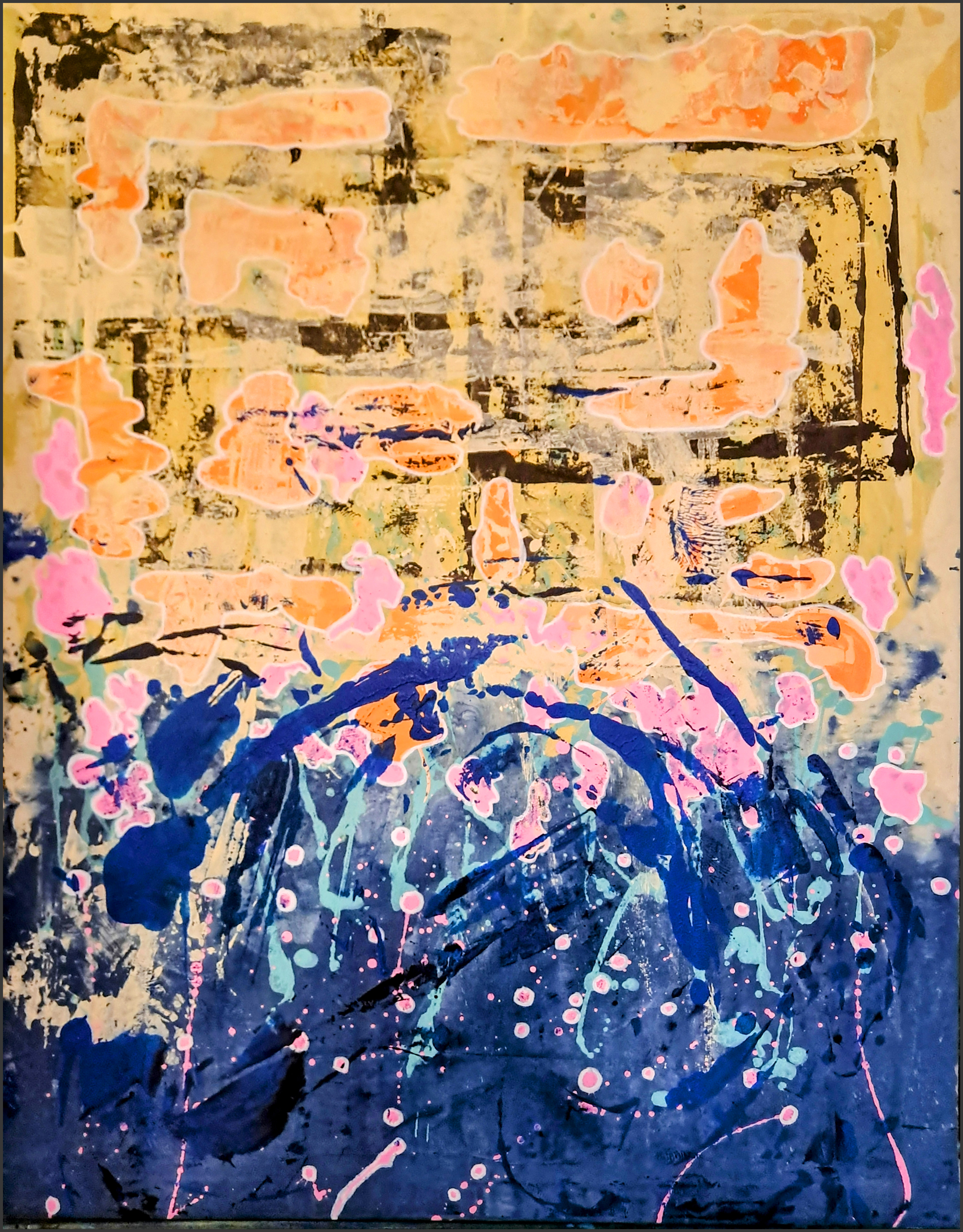 Et landskab af blå og violette bølger brydes af lysende pletter i rosa og orange, som blomster, der drømmer sig op mod lyset. Som et glimt ud gennem et vindue til en verden, hvor farver flyder frit og natten selv synes at blomstre.