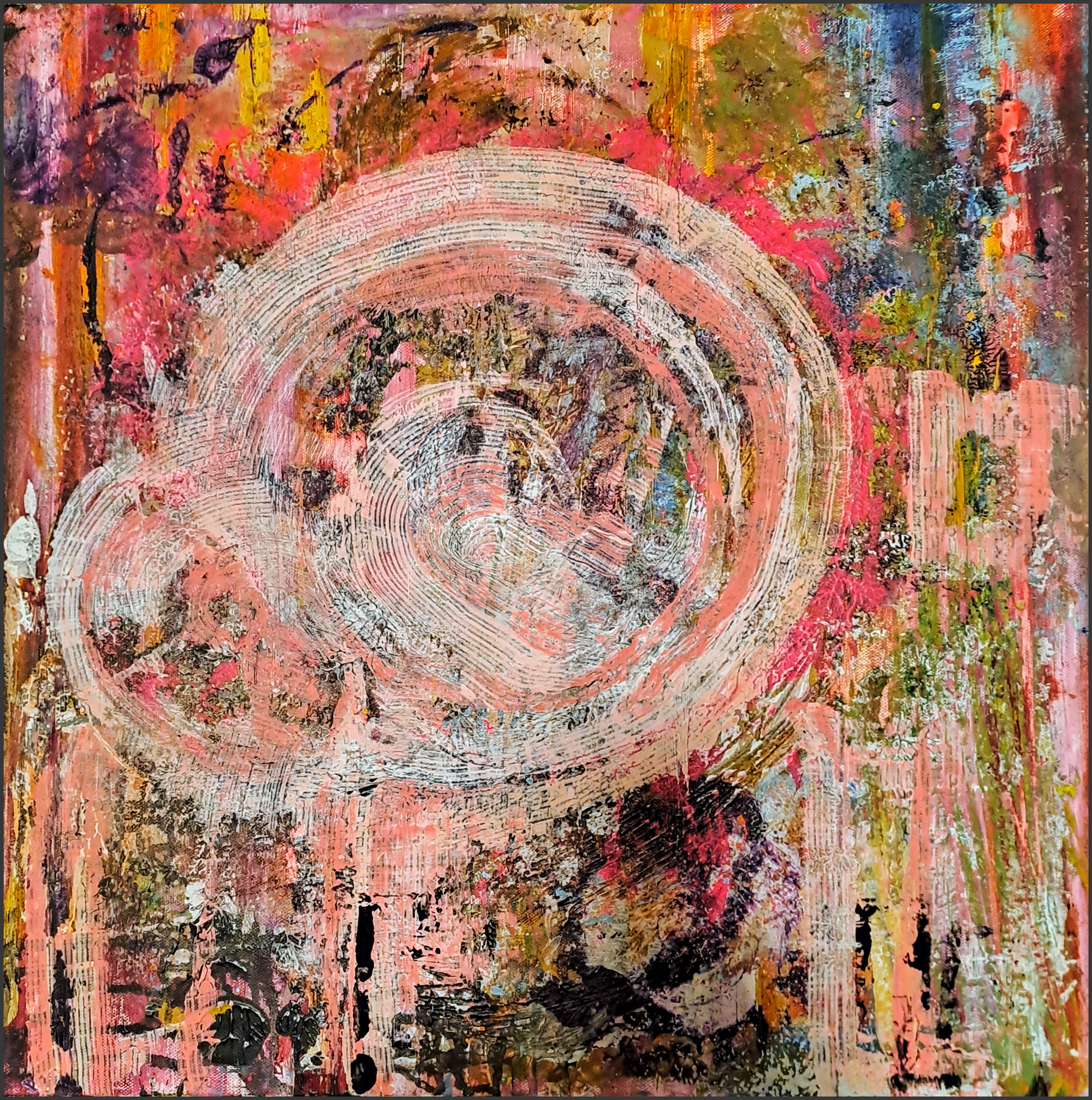 Farverne strømmer som safter i jorden, hvor alt spirer og vender tilbage. Midt i billedet folder spiralen sig ud som en livmoder – et rum for begyndelser, et løfte om vækst. Her mødes ild og jord, skabelse og opløsning, i en evig bevægelse. Maleriet bliver til en hymne for frugtbarhed, hvor hvert strøg er et frø, der sætter liv i verden.