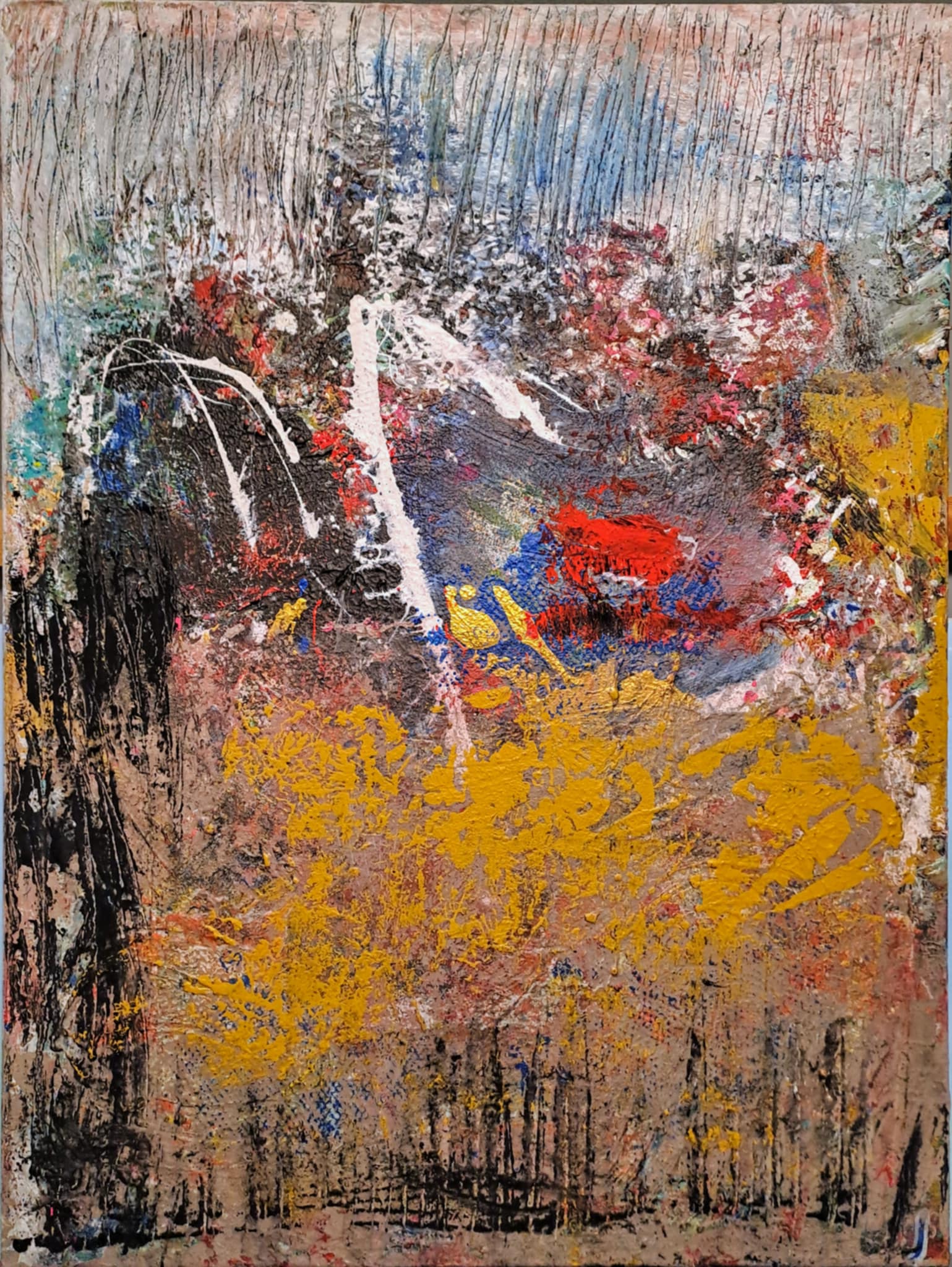 Gule flammer bruser som vilde marker, mens sorte skygger rejser sig i stilhed. Et øjeblik fanget i naturens rå oprør. Løvet gløder i gyldne spor, rødmen sitrer i vinden. Grenenes sorte skrift tegner afsked mod himlen, mens efteråret brænder ud i farver.