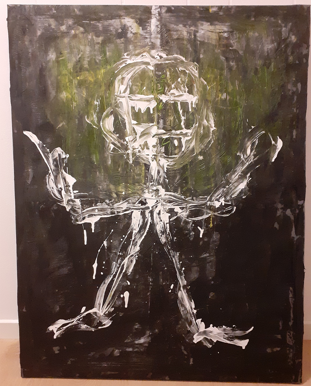 En skikkelse af lysende streger danser frem i mørket – som om den væver skyer og trækker regn ud af himlen. Hænderne strakt, fødderne rodfæstede, en åndelig regnskaber, der kalder liv ned over jorden.