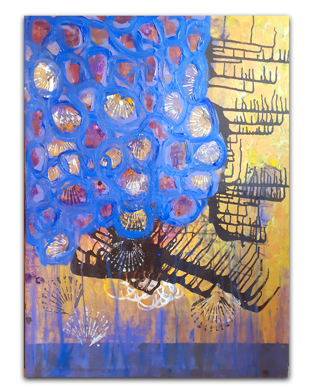 Et hav af blå cirkler åbner sig som et koralrev i drømmenes dyb. Guldglimt og organiske mønstre flyder gennem billedet som skjulte skatte under overfladen. Her mødes lys og vand, struktur og opløsning – et åndedrag fra havets stille evighed.