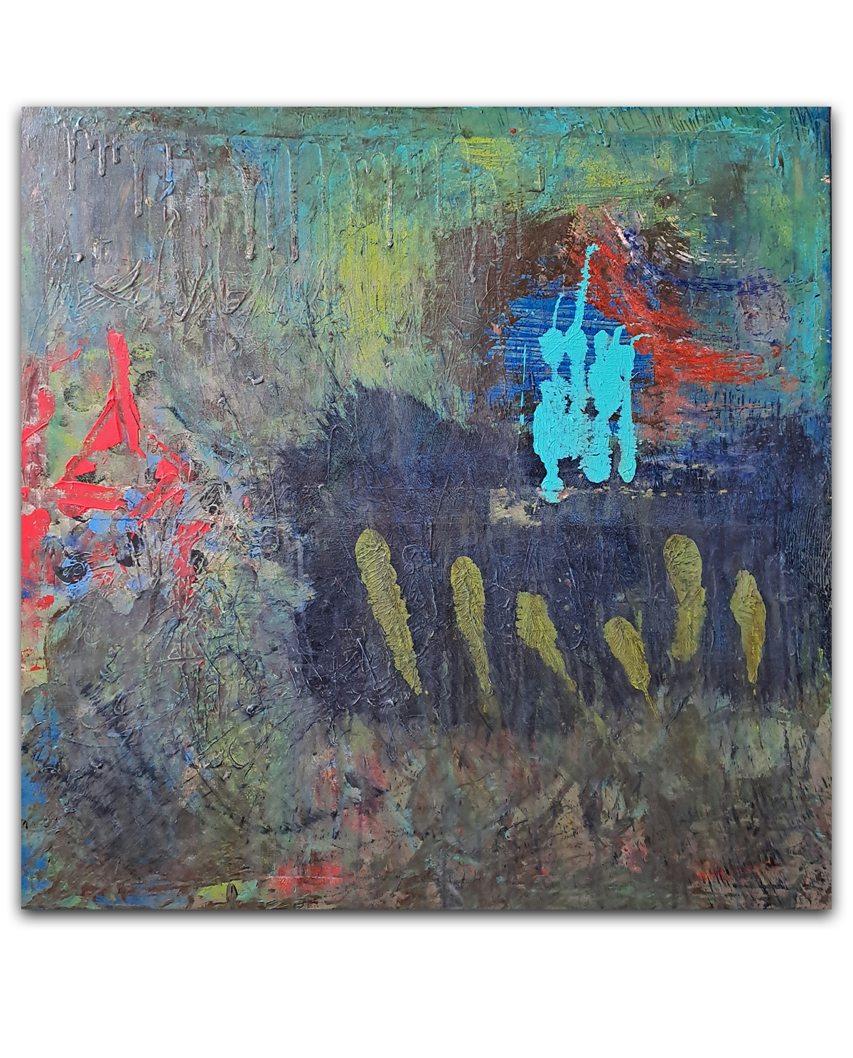 Som dråber af himmel falder blå linjer gennem et brændende landskab af orange og rød. Et net af tanker breder sig som nervetråde, viklet ind i varme og kaos. Her mødes ild og vand, opløsning og fornyelse – hvor verden ånder tungt, men stadig håber. Noget falder, noget vokser. Et øjeblik mellem opløsning og ro.