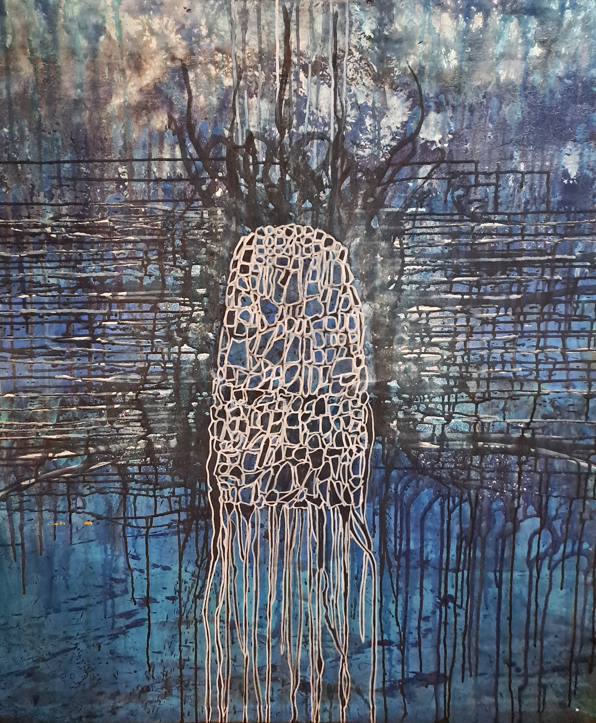 Værket har en stærk stemning – næsten som noget både organisk og åndeligt. Som en undervandsvæsen rejser figuren sig i det blå dyb, flettet sammen med vandets rytme og mørkets strukturer. En skikkelse af skrøbelighed og styrke, vævet af tråde og stilhed. Et billede på transformation og indre tilstedeværelse.