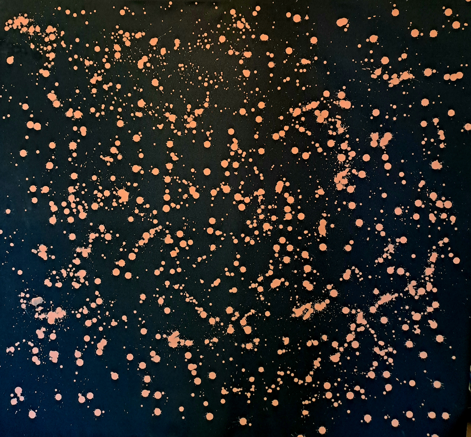 Som et mørkehav brudt af lys, svæver prikkerne som stjernestøv, et stille regn af kosmos, fanget i øjeblikkets tavse glimt. Små gnister af evighed driver på himlens sorte lærred. Et stille kort over stjerner, et fragment af uendelighedens mønster.