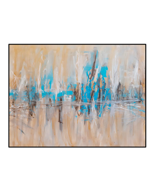 Et landskab af sindet folder sig ud, brændte okkerfarver som tør jord, streger som nervetråde, forbundet i skjulte mønstre. En blå cirkel svæver tungt, halvt måne, halvt organisme, som et øje, der ser gennem lag af tid. Nedenfor ligger et felt af gule prikker, som frø eller stjerner, et nærende mylder – mad for tanker, drømme og vækster. Alt synes at tale om forbindelser: det usynlige net, hvor ideer vokser, hvor det abstrakte bliver konkret, og hvor hjernen selv er et landskab.